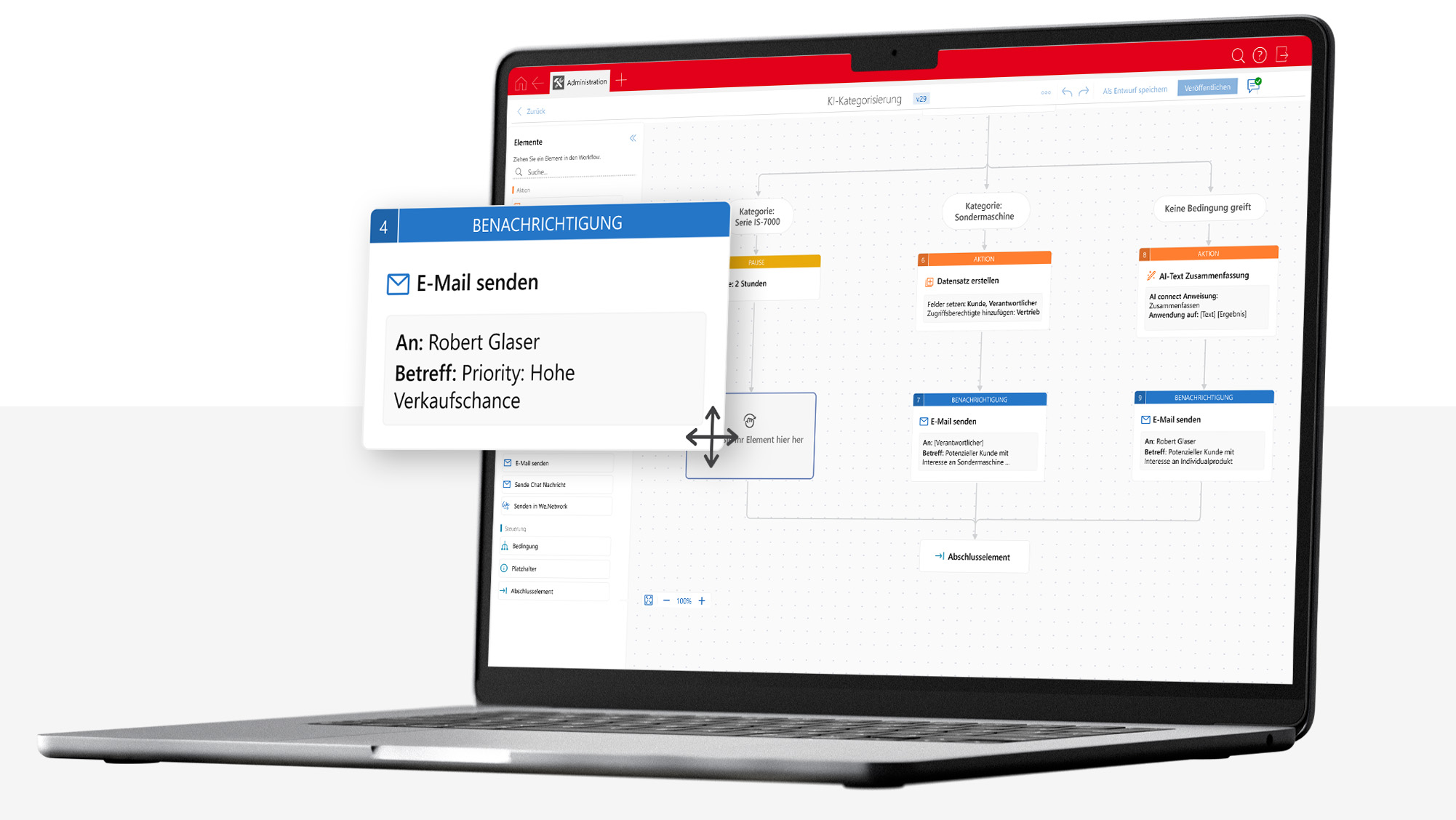 CAS BPA (Business Process Automation) bringt Automatisierung direkt ins CRM. Wiederkehrende Geschäftsprozesse – z. B. Angebots- oder Serviceanfragen – werden per Drag-&-Drop visuell modelliert, automatisiert und zuverlässig gesteuert. Ohne Programmierung. Auch komplexe Abläufe lassen sich mit wenigen Klicks abbilden.